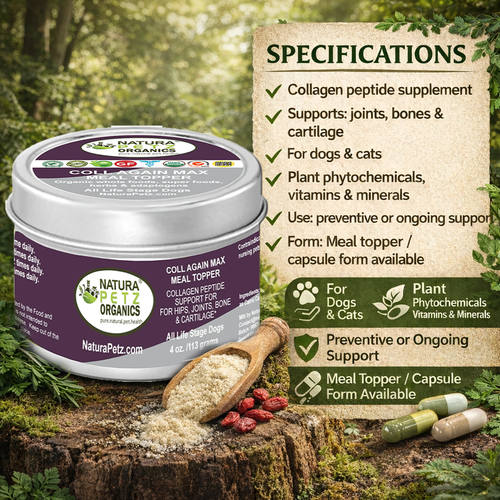 Coll Again Max Collagen Peptide Support is a premium collagen peptide supplement formulated to support joint, bone, cartilage, and connective tissue health in both dogs and cats. Its unique blend of plant-based phytochemicals and collagen peptides may help stimulate collagen synthesis, enhance skeletal structure, and support mobility for active, aging, or joint-prone pets.
